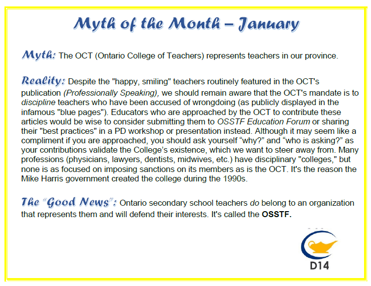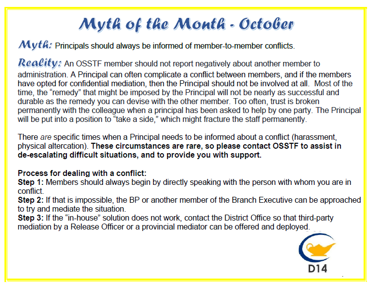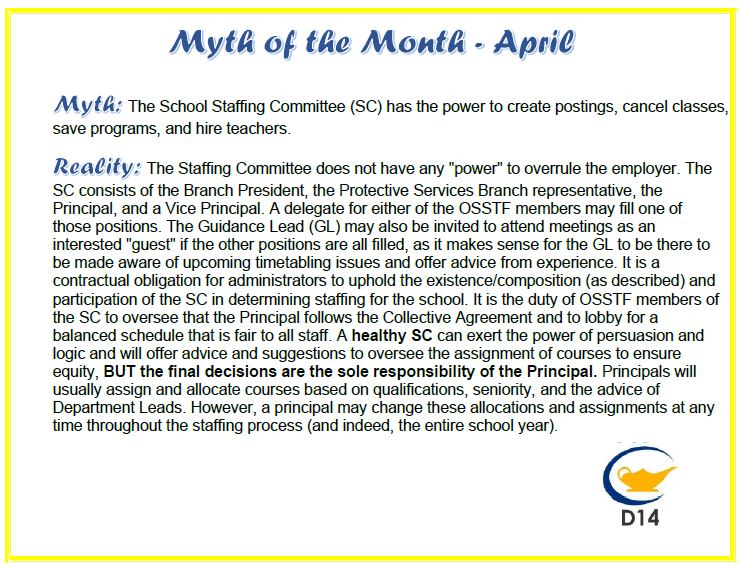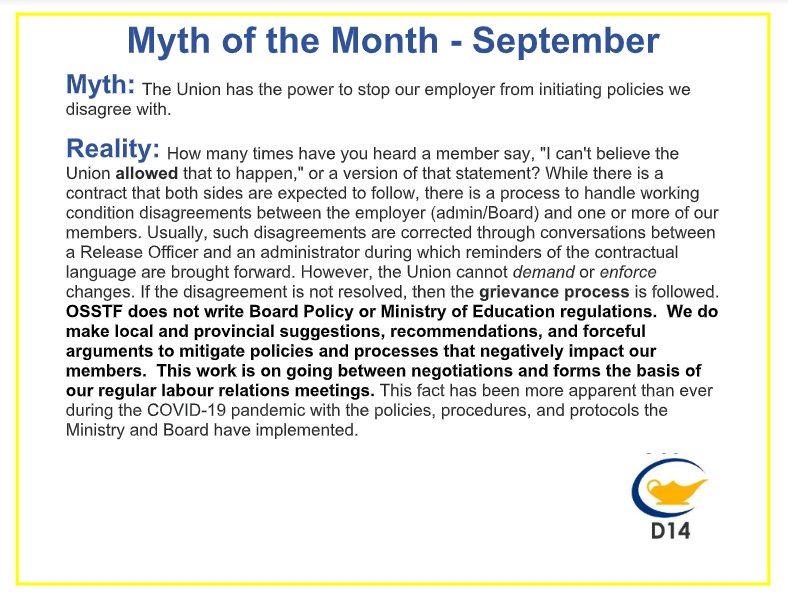 OSSTF District 14 advocates and serves approximately 1000 members who belong either to the Teachers’ Bargaining Unit or the Occasional Teacher’s Bargaining Unit in Clarington, Northumberland, and Peterborough. District 14 works to promote and enhance public education through engagement, negotiations, and by offering professional growth and development to our members.